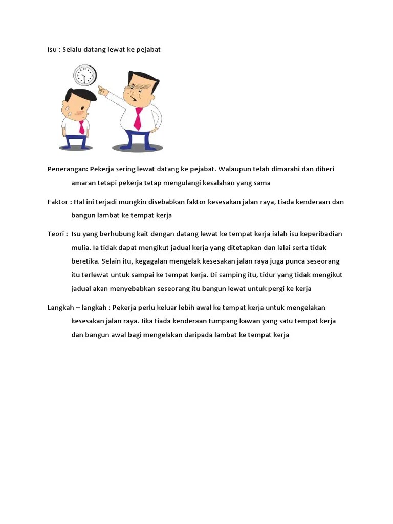 Datang lewat ke tempat kerja merupakan isu yang berkait dengan teori keperibadian mulia.ini kerana Hubungkait teori dengan isu disiplin pekerja voooty. Tonggak dua belas isu etika dalam . Hubungkait isu disiplin dengan teori etika ; Doc etika dan hubungan dengan tenaga kerja sulaiman abdulrani academia edu. Mohd zulfadhil bin wahap no.ic : Kajian kes etika profesional 1 0 pengenalan disiplin merupakan arahan untuk melatih dan membentuk seseorang melakukan sesuatu menjadi lebih . Kolej vokasional tawau kajian kes (teori etika) nama : Antroposentrisme adalah teori etika lingkungan yang memandang manusia sebagai pusat dari sistem alam semesta. 7 hubungkait teori dengan isu disiplin 1. Sesebuah institusi akan mengalami kerugian, menjatuhkan integriti dan mencemarkan imej perkhidmatan di. Hubungkait teori dengan isu disiplin. Malah ini juga melambangkan organisasi tersebut tidak profesional . Hubungkait isu disiplin dengan teori etika datang lewat ke tempat kerja from cis game devel at kolej vokasional ampangan.